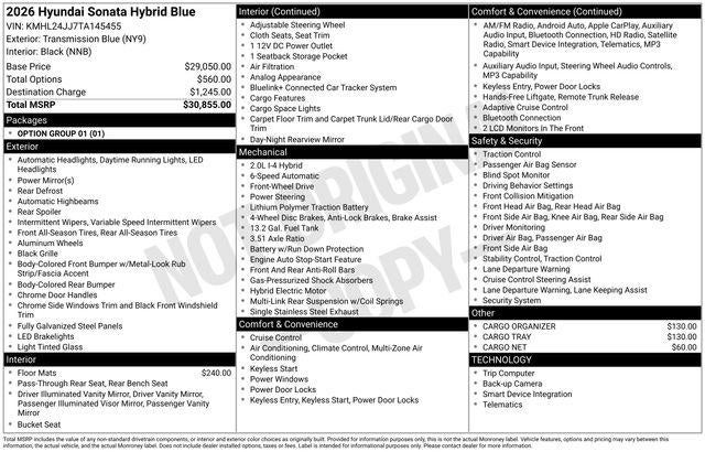 2026 Hyundai Sonata Hybrid Blue 44/51 City/Highway MPG